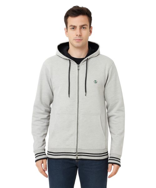 Sleeves: Ribbed cuffs with twin stripe pattern (black and grey)
